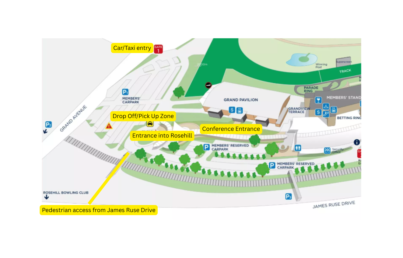Rosehill Gardens is situated approximately 20km west of the Sydney CBD in the geographical heart of the city, with parking available on-site. Delegates can also travel by train to Parramatta Station or by ferry to Parramatta to connect with light rail services or regular bus services to Rosehill Gardens.